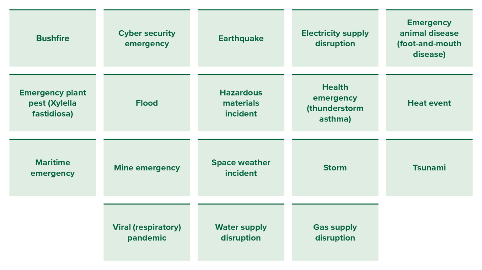 - The 2023 Emergency Risks in Victoria Report (2023) identifies 18 state-level emergency risks.24 They are identified below: