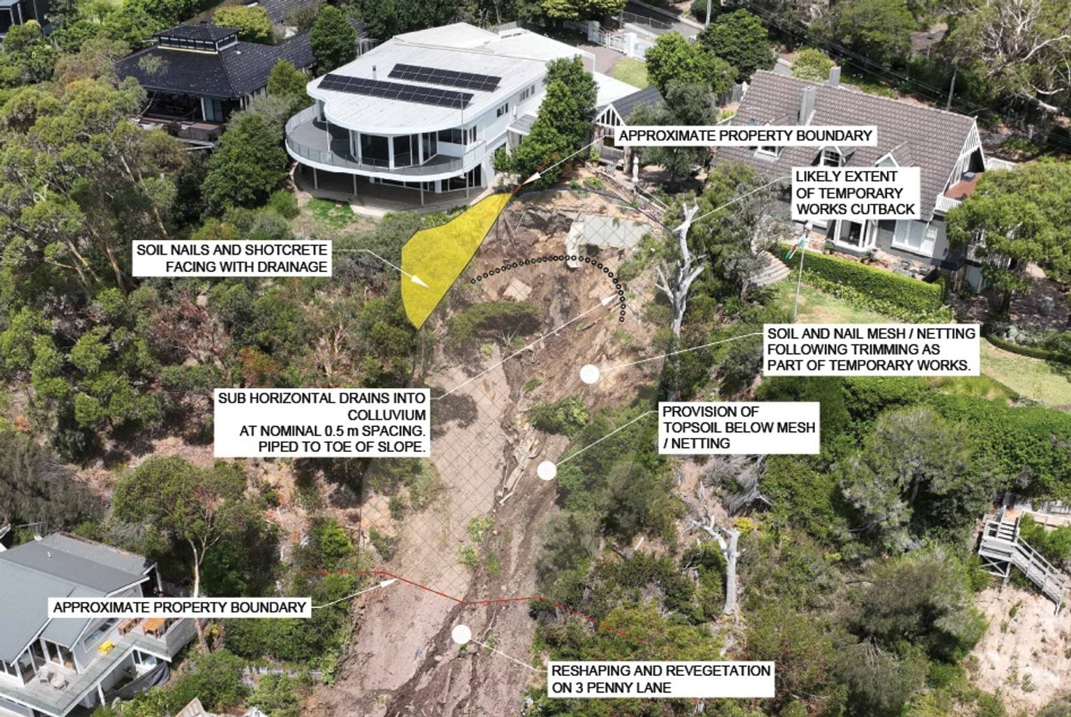 - Slope toe works: this involves demolition of the building debris on 3 Penny Lane and repair work at 607–609 Point Nepean Road.