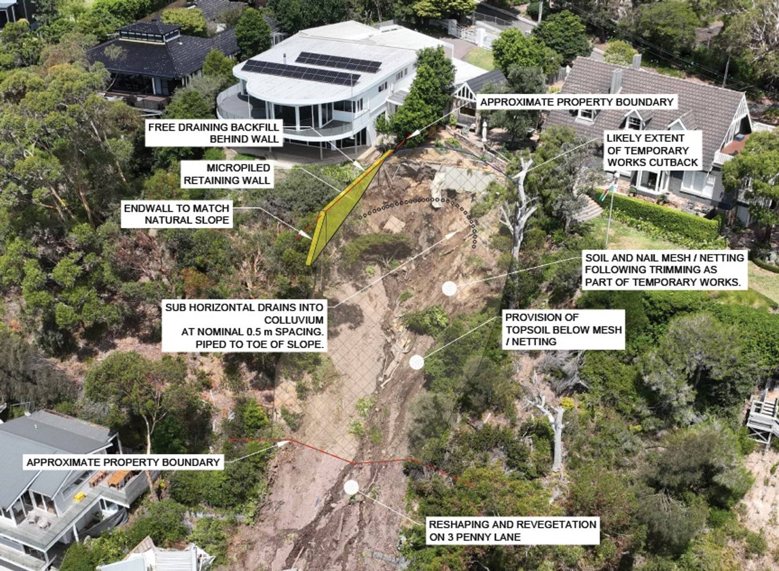 - Mr Paul and Mr Pope have considered the current condition of the landside site and separately developed design concepts to mitigate the risk of further landslides. A common element in both designs is the initial step of clearing debris from 3 Penny Lane before any work proceeds.3 Where the two concepts differ is in their approach to remediation. Mr Paul’s design is more sophisticated, as it seeks not only to mitigate the risk of future landslides but also to repair the damage to the escarpment caused by the landslides.