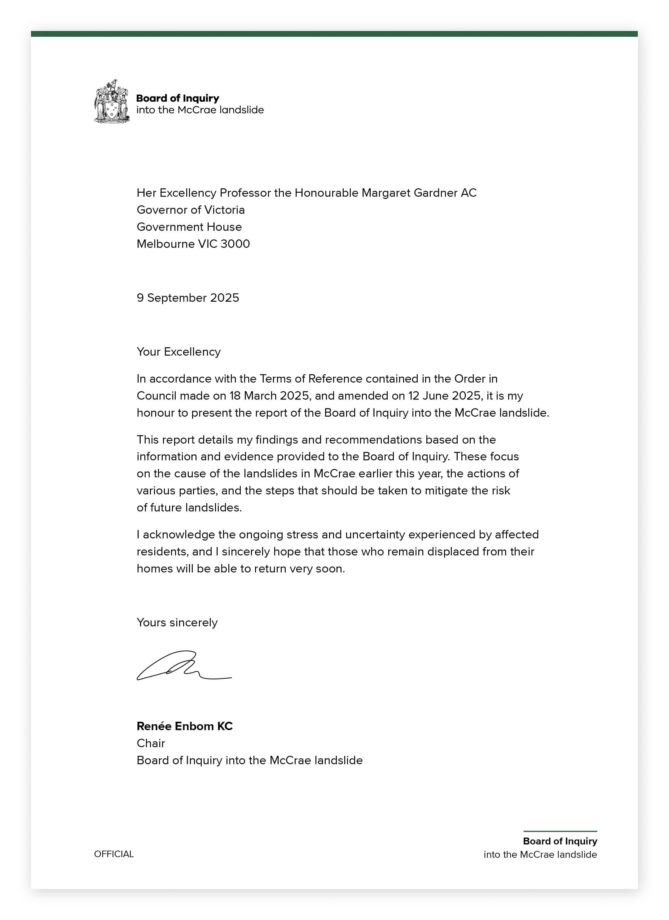 On 18 March 2025, the Board of Inquiry was established to inquire into, report on, and make recommendations in relation to, amongst other things, the cause of the landslide that occurred on 14 January 2025 in McCrae on the Mornington Peninsula (McCrae Landslide), the adequacy of measures taken to prevent and minimise landslides in McCrae, and measures to be taken for the prevention or mitigation of the risk of similar landslide events occurring again in McCrae.